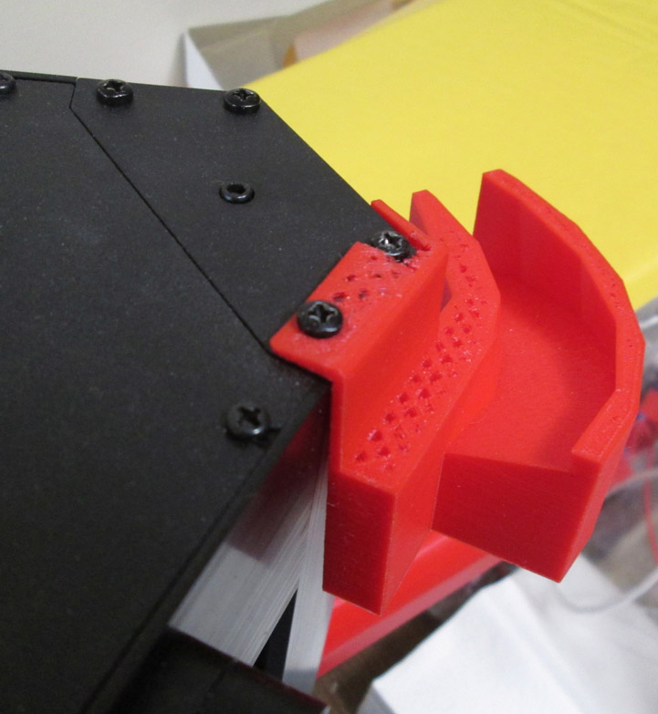 Next on the useful list was an unexpected surprise. My friend Dave has an HP 2200 laserjet printer that the manual tray door won't stay closed on. It's a common problem and you can't buy (for a reasonable price) a replacement door because they have all broken. I figured it was worth a shot to search Thingiverse just in case and was pleasantly surprised that someone actually had developed a solution for this problem. It's a tiny part that wedges in the side of the door and provides a new way to keep the printer closed. It was a 5 minute print and I used a piece of the PolyLite Red that had broken off on an earlier print. I only had about 30 cm available but it was enough (it's a tiny part). It's working perfectly!